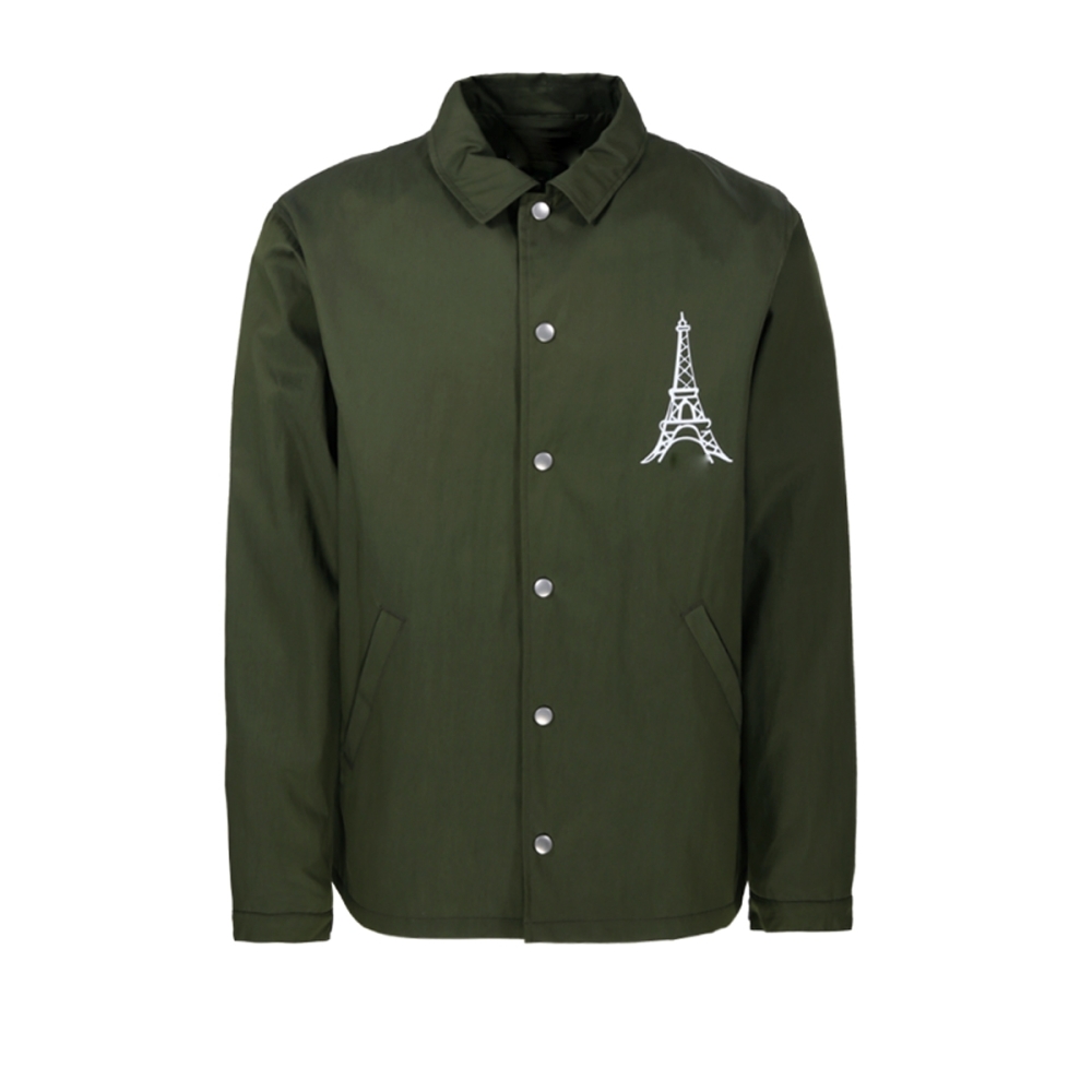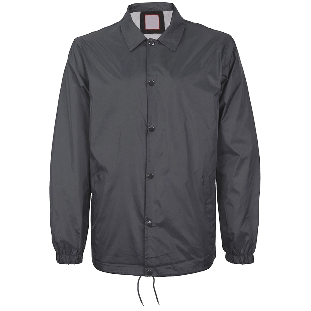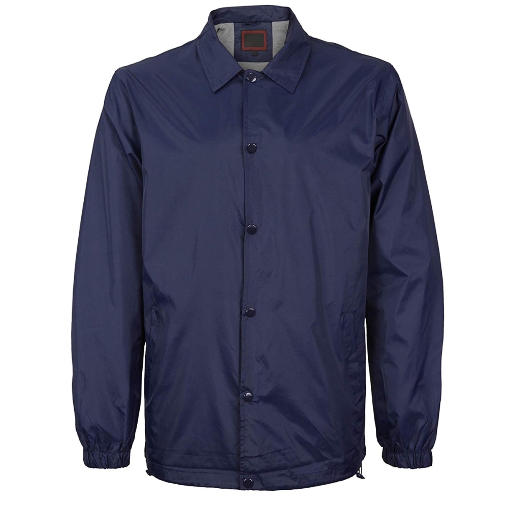 This premium coach jacket features a spread collar, long sleeves, banded cuffs, two front slit pockets and a front button fastening with adjustable tabs at the waist.