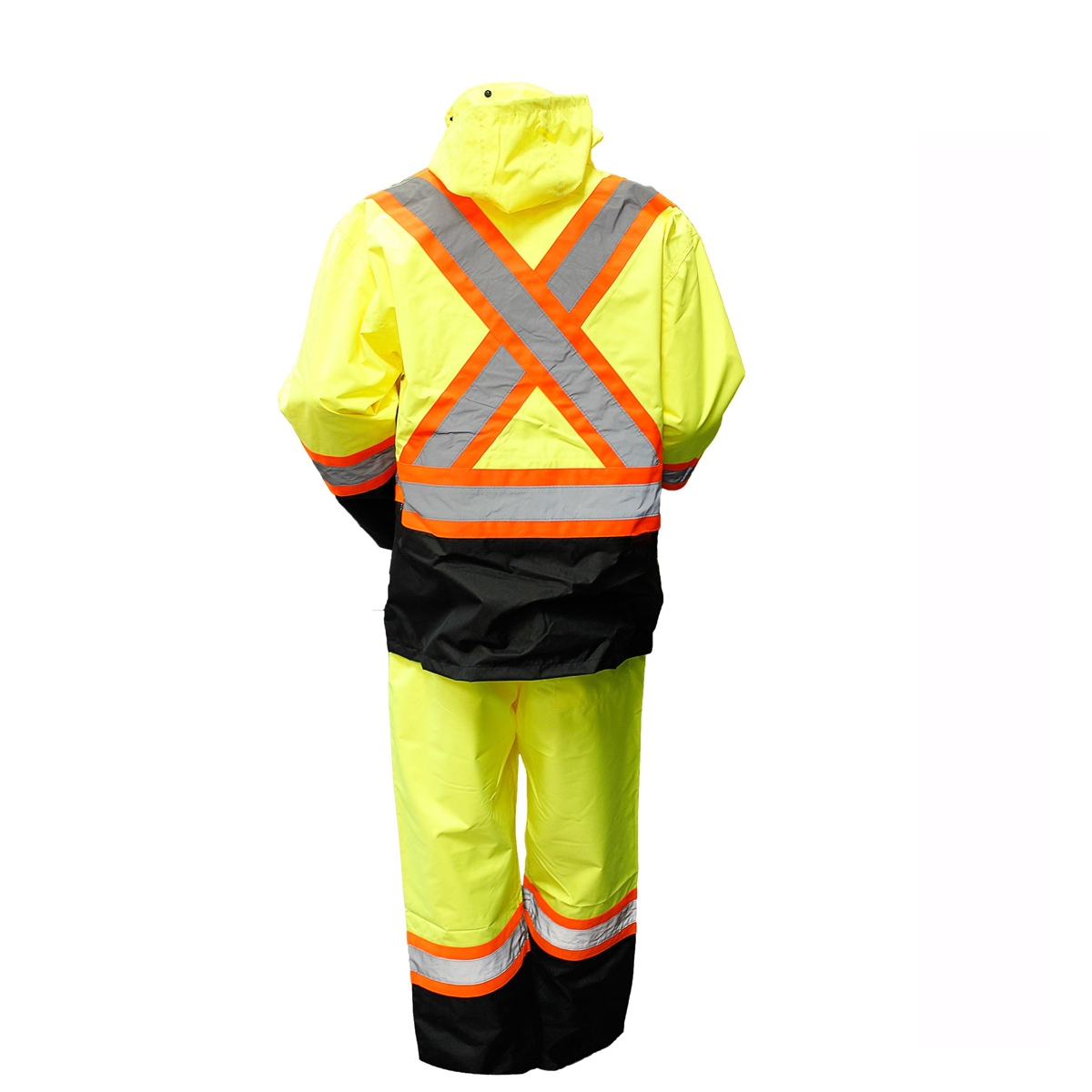 • Features Lightweight fabric|Reflective bands,Elasticated waist on trousers,Heavy duty zipper front on jacket|Front flap pockets on jacket|Taped seams|Adjustable ankle poppers.