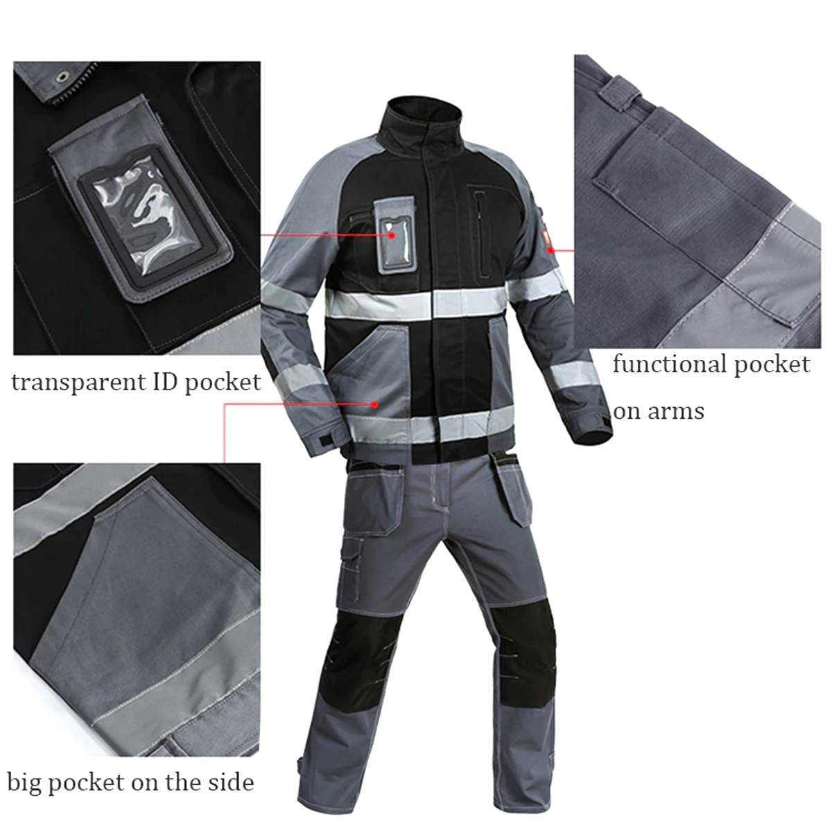 • Work suits are typically fastened up the front with a zipper, button, snap, or velcro, and have pockets and tool loops.